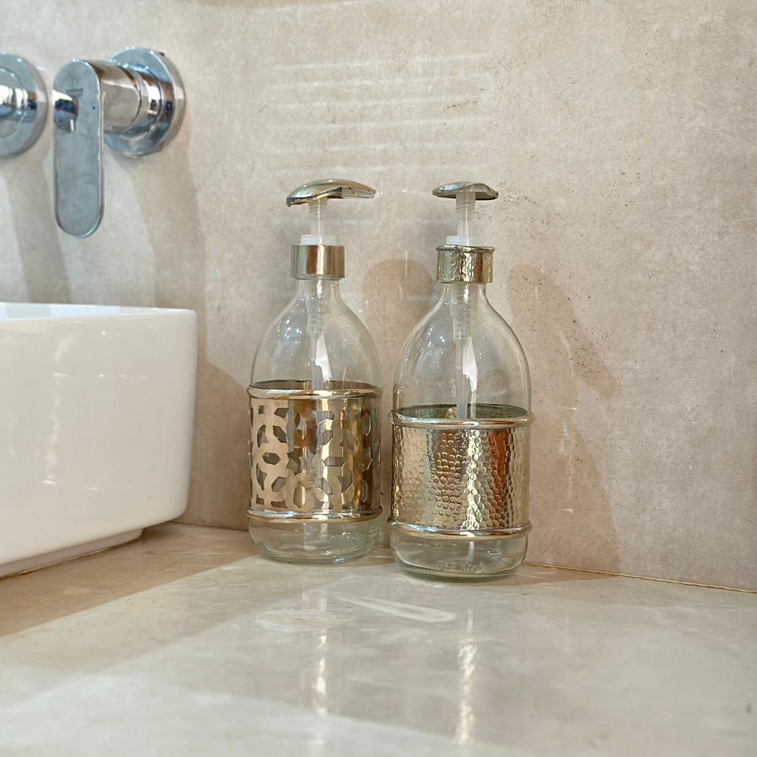Apportez une touche d'élégance et de tradition à votre salle de bain ou cuisine avec ce distributeur de savon artisanal en verre et laiton argenté, décoré de magnifiques motifs zellige marocain. Son design raffiné et sa capacité généreuse en font un accessoire à la fois pratique et décoratif, parfait pour un intérieur inspiré de l'artisanat marocain.