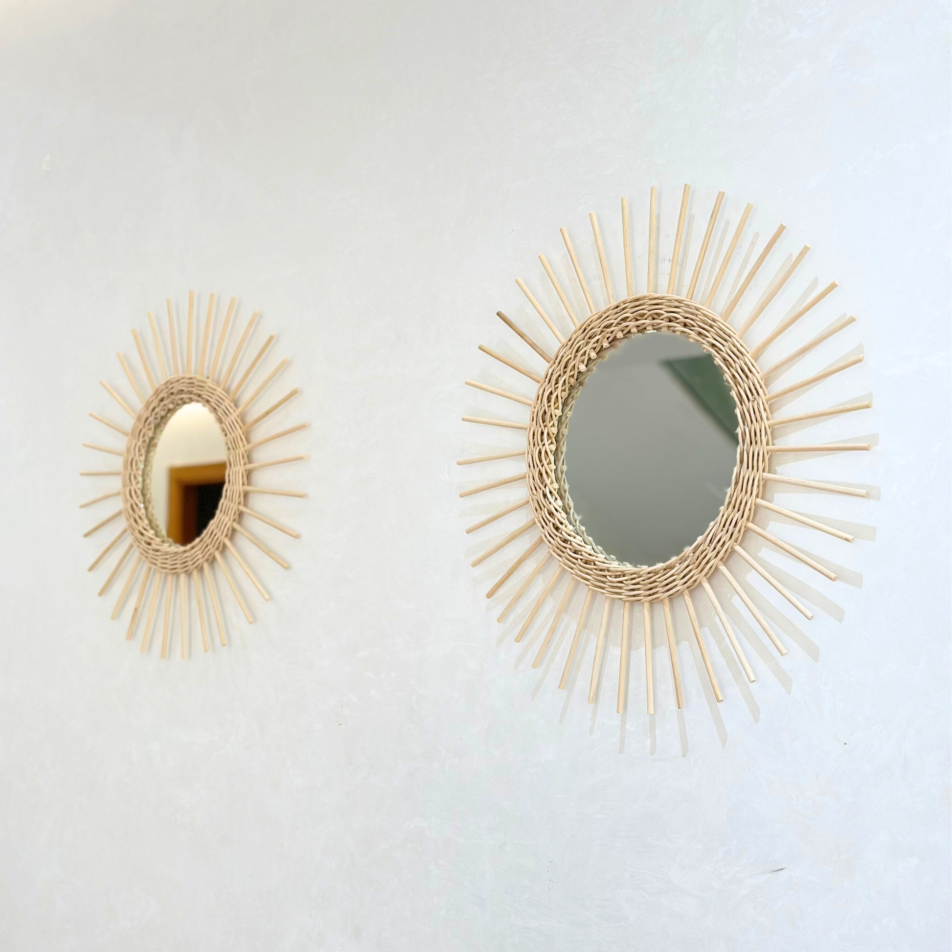 Ajoutez une touche solaire à vos murs avec ce miroir en rotin tressé en forme de soleil. Inspiré des rayons lumineux du désert marocain, ce miroir allie artisanat traditionnel et design épuré. Son diamètre de 47 cm en fait une pièce décorative idéale pour éclairer une entrée, une chambre ou un coin salon.