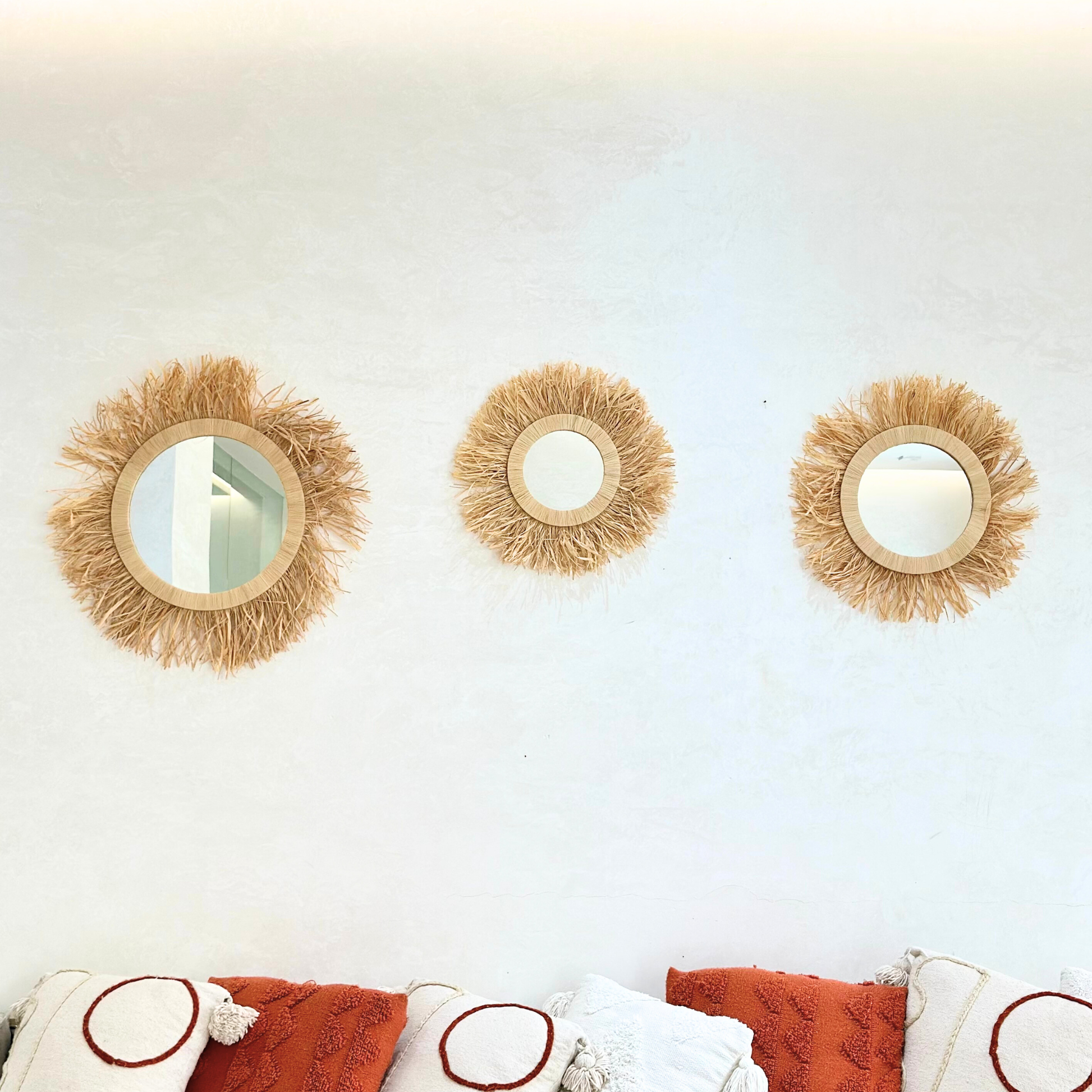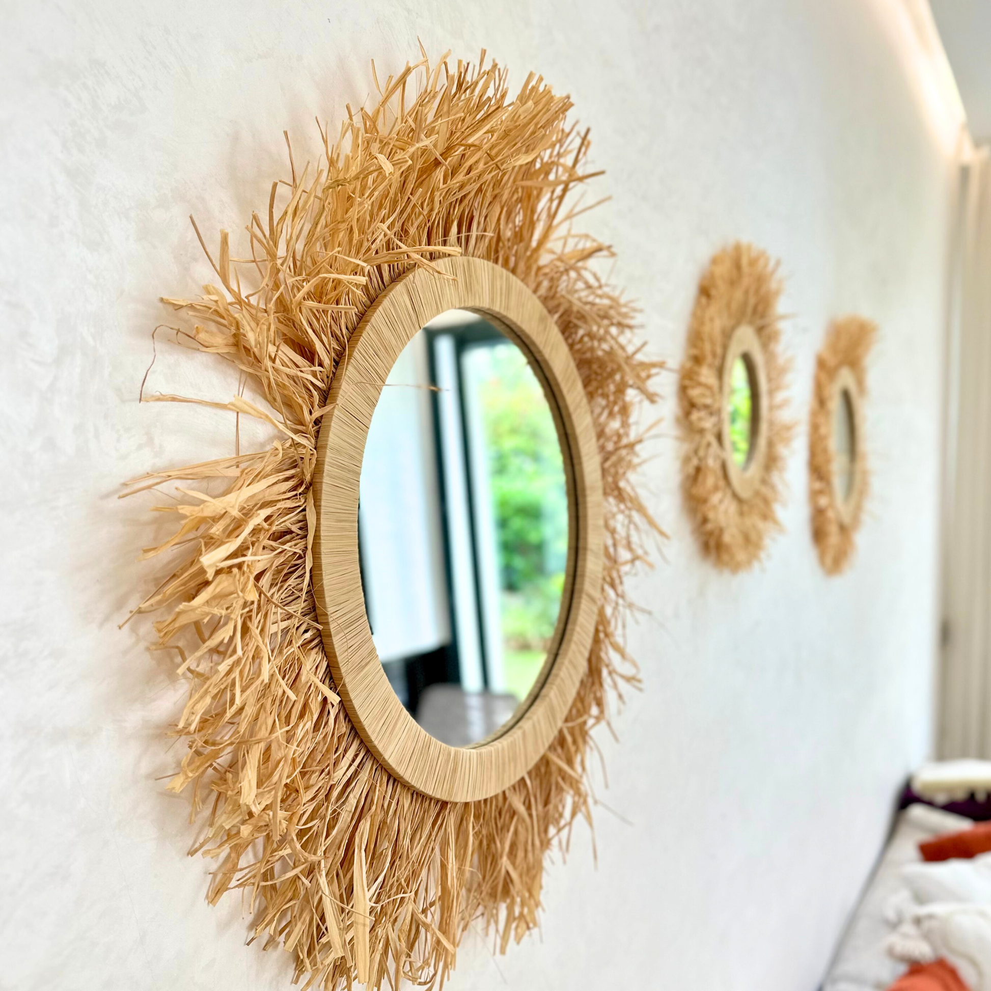 - Matériaux : Miroir en verre, encadrement et franges en raphia naturel
